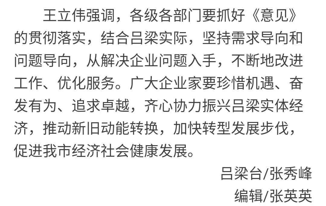 導(dǎo)語:10月13日,市委書記李正印主持召開我市深入學(xué)習(xí)貫徹落實(shí)中共中央、國務(wù)院《關(guān)于營造企業(yè)家健康成長環(huán)境弘揚(yáng)優(yōu)秀企業(yè)家精神更好發(fā)揮企業(yè)家作用的意見》(下稱《意見》)座談會(huì),共商呂梁經(jīng)濟(jì)發(fā)展大計(jì)。市長王立偉、市人大常委會(huì)副主任梁來茂、副市長楊巨才出席會(huì)議。9大產(chǎn)業(yè)13個(gè)行業(yè)協(xié)會(huì)負(fù)責(zé)人參加會(huì)議。